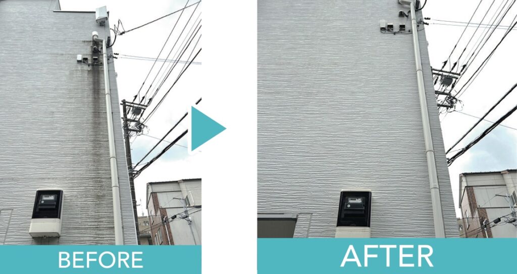 足場不要・低コストで外壁の汚れを落とし、明るさを取り戻す施工です。